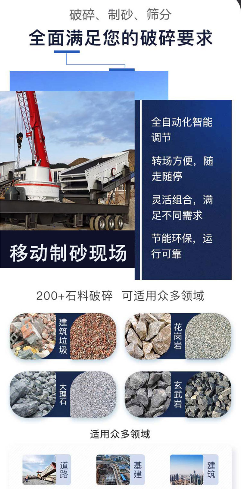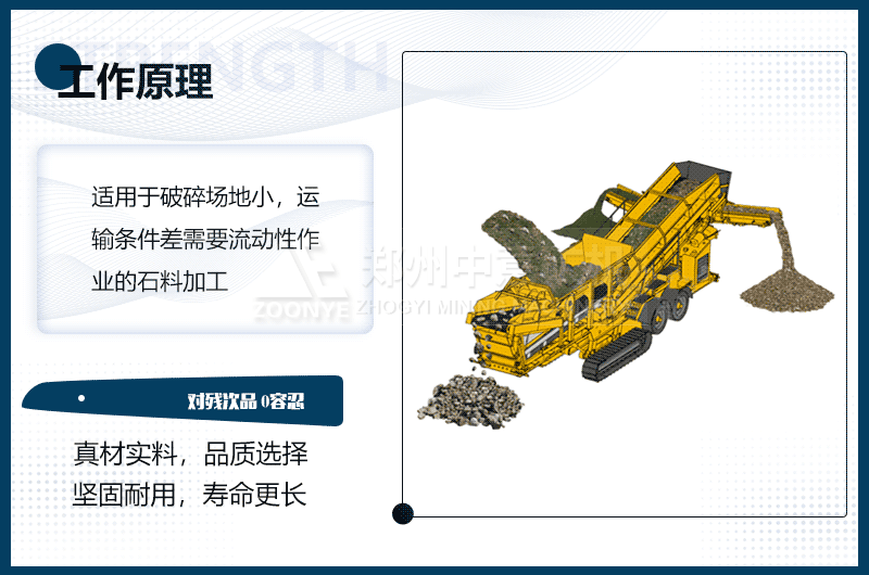 輪胎式立破移動篩分站運作當中,各項給料、破碎、篩分設備協調工作,原料先進入破碎設備進行破碎加工,在此期間骨料被破碎過程當中被修整為規則、通透度很強的顆粒狀再生骨料,制砂之后,進入專用篩分機設備,后合格的骨料通過出料口排出,未達到客戶要求的骨料再次進入破碎機,從而形成一條閉合回路的效應。整個生產過程當中,運用自驅行走的移動車身設計,大大提高了設備的安全性、有效性以及現場的可隨機應變性能。