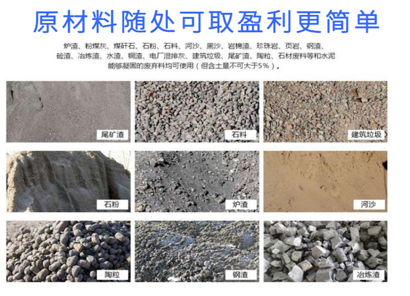 建筑垃圾、裝修(裝潢)垃圾、電廠鋼廠濕排灰、干排灰、混排灰、爐渣、自燃煤矸石、石粉、石硝(小石子)、沙子、陶粒、尾礦砂、火山灰(渣)、鋼渣、電石渣、水淬渣、風(fēng)淬渣、重礦渣、冶煉渣、水渣、旱渣、硫酸渣、磷肥渣、堿渣、鋁廠紅泥、電石泥、電解銅渣、工業(yè)廢渣、廢陶瓷渣、廢磚粉、頁(yè)巖等各種原料生產(chǎn)免燒磚,空心磚,多孔水泥磚,彩色地磚,路沿石等。