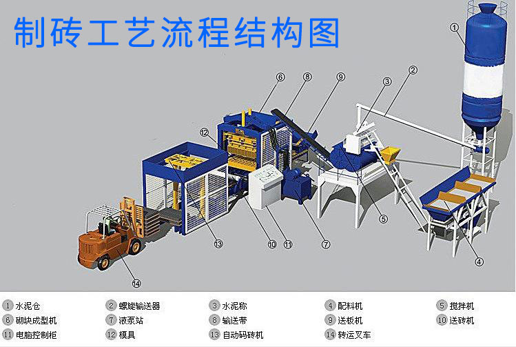 建筑垃圾制磚系統(tǒng)組成部分說(shuō)明1、水泥倉(cāng) 2、螺旋輸送器 3、水泥稱 4、配料機(jī) 5、攪拌機(jī) 6、砌塊成型機(jī) 7、液泵站 8、輸送帶 9、送板機(jī) 10、送磚機(jī) 11、電腦控制柜 12、磨具 13、自動(dòng)碼垛機(jī) 14、轉(zhuǎn)運(yùn)叉車