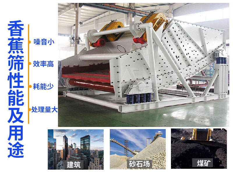 香蕉篩其實(shí)就是形狀像香蕉的振動(dòng)篩。振動(dòng)篩是篩分設(shè)備,該設(shè)備在振動(dòng)的篩板上輸送材料,使尺寸小于篩孔的材料通過(guò)篩板,同時(shí)機(jī)繼續(xù)輸送未通過(guò)篩板的材料,直到材料派出端部為止,從而實(shí)現(xiàn)物料的分級(jí)、脫水、脫泥、脫介的目的。