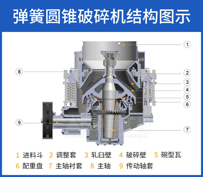主要有機架、水平軸、動錐體、平衡輪、偏心套、上破碎壁(固定錐)、下破碎壁(動錐)、液力偶合器、潤滑系統、液壓系統。
